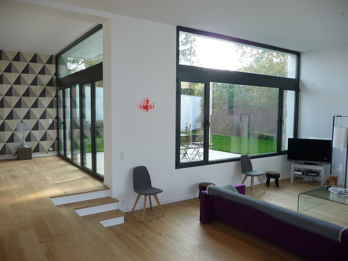 Les espaces de vie (salle à manger, salon et cuisine) sont aménagés au rez-de-chaussée et bénéficient de grandes surfaces vitrées