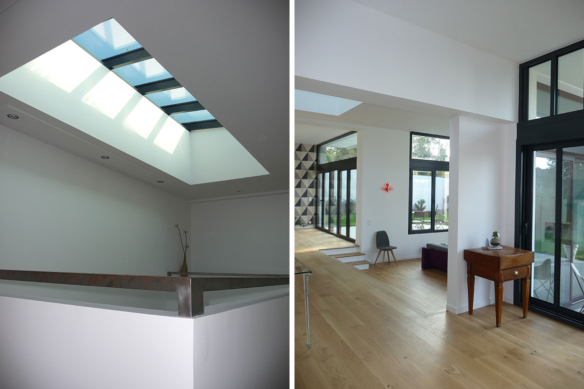 Les espaces nuit (chambres, pièces d’eau) sont aménagés à l’étage avec des ouvertures cadrées
