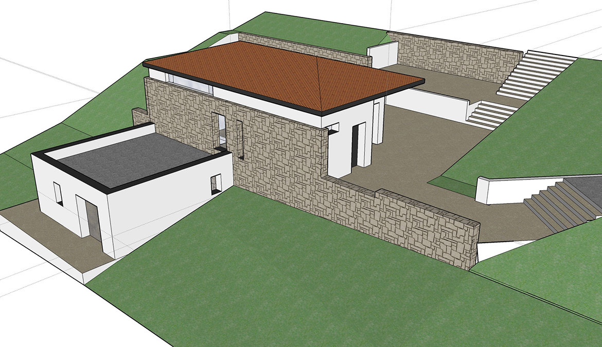 Un mur en pierre sépare ces deux volumes sur toute la longueur de la maison, l’accès piétons de la maison se faisant le long de ce mur.
